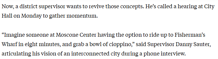 BUT now we may see some progress! Supervisor Danny Sauter, whose district includes North Beach, Chinatown, the twisty part of Lombard, and the retro-future Hyatt on Market, wants to GET SOME SHIT GOING!