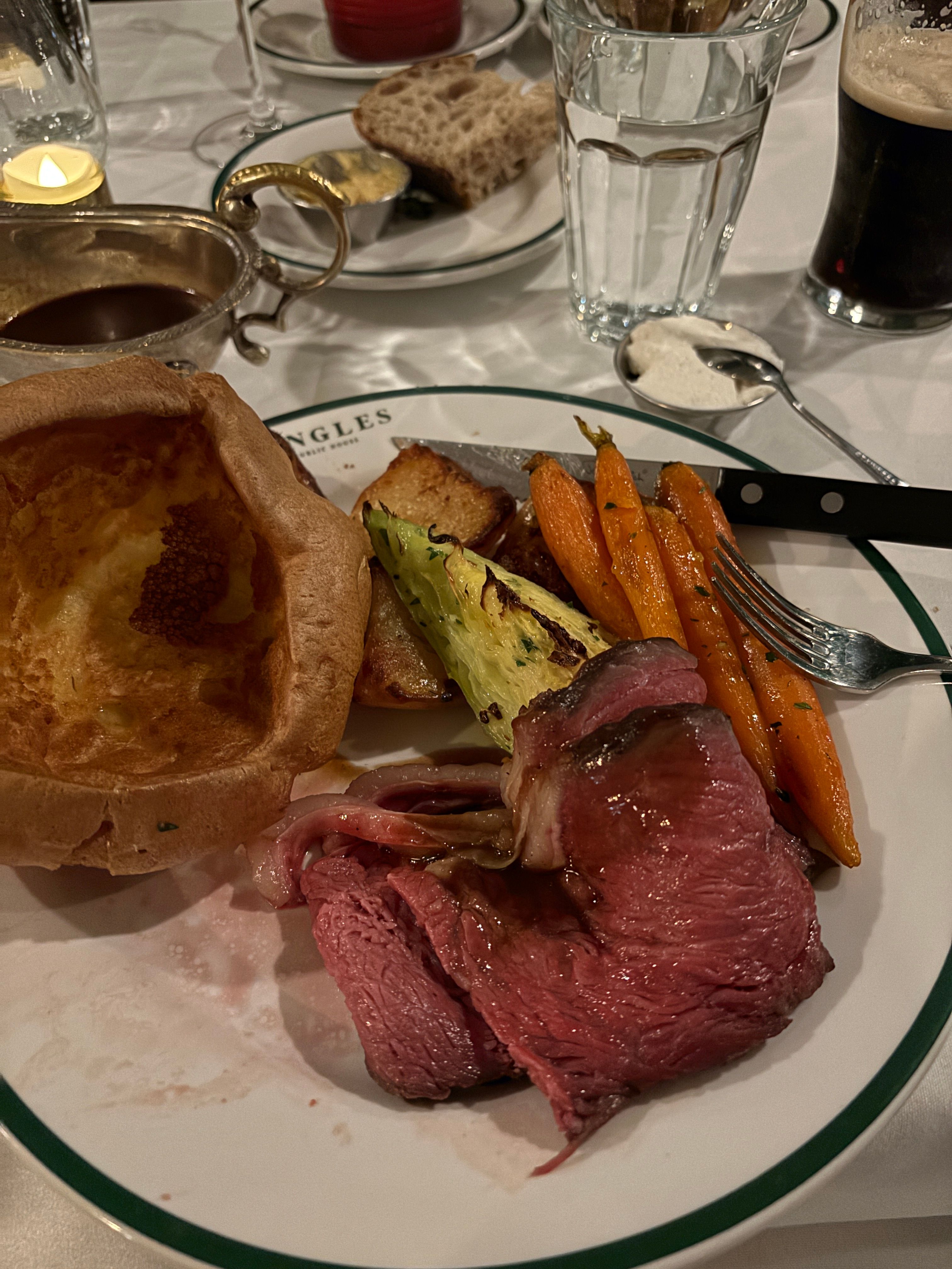 So the idea is you decamp to a pub on a Sunday afternoon and drink ale and/or spirits and eat a huge motherfucking lunch, like with a big meat and vegetables and Yorkshire pudding, which isn’t pudding at all but kind of like a bread thing that looks like a huge failed muffin idk. You wash all this down with gallons of alcohol and then stumble out like Emma Thompson. I loved it! The pub was bright and convivial and everyone was so friendly when I went to the bar and they were impressed an American dolt was ordering Guinness instead of, I guess, Coors Light.